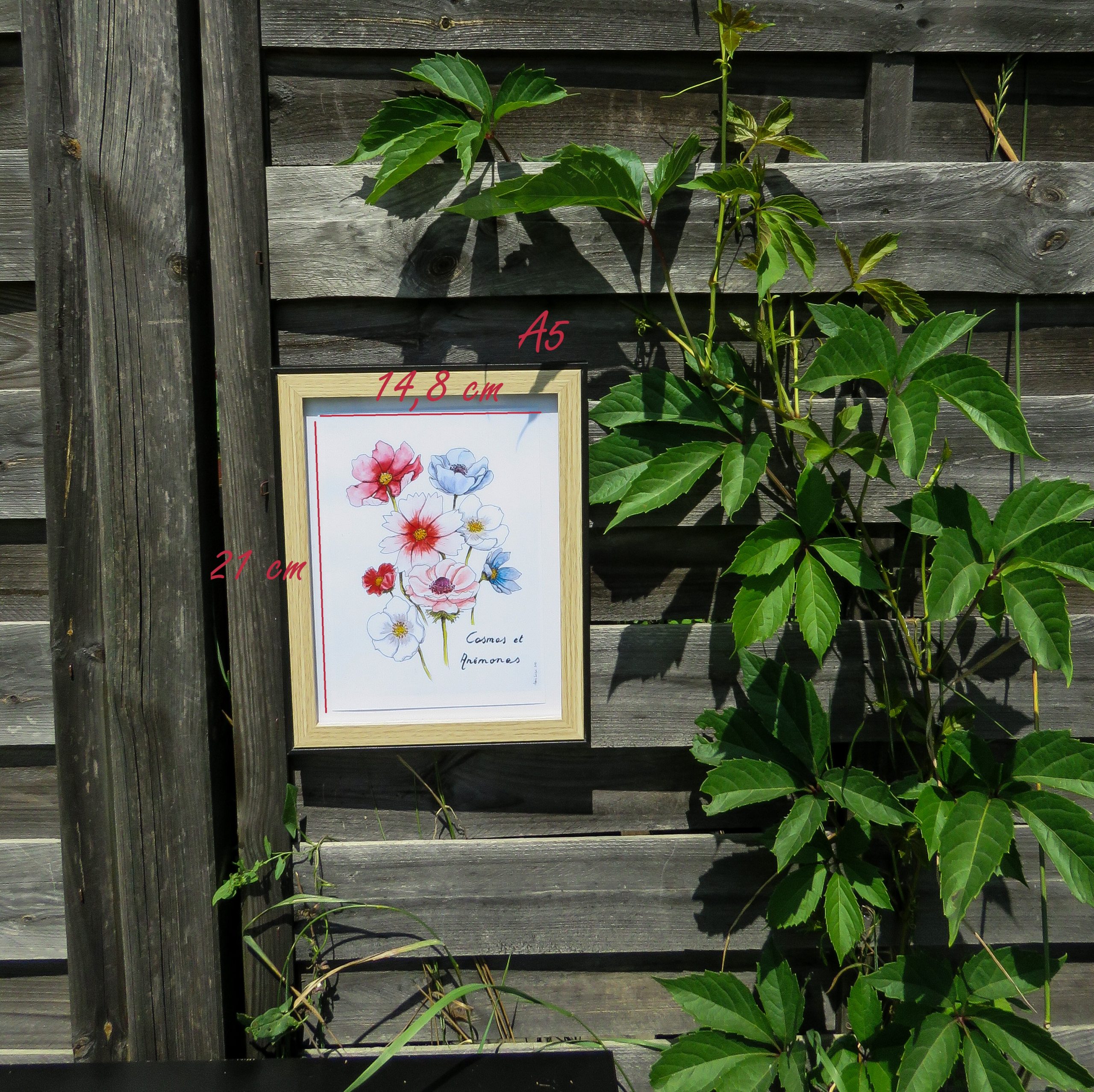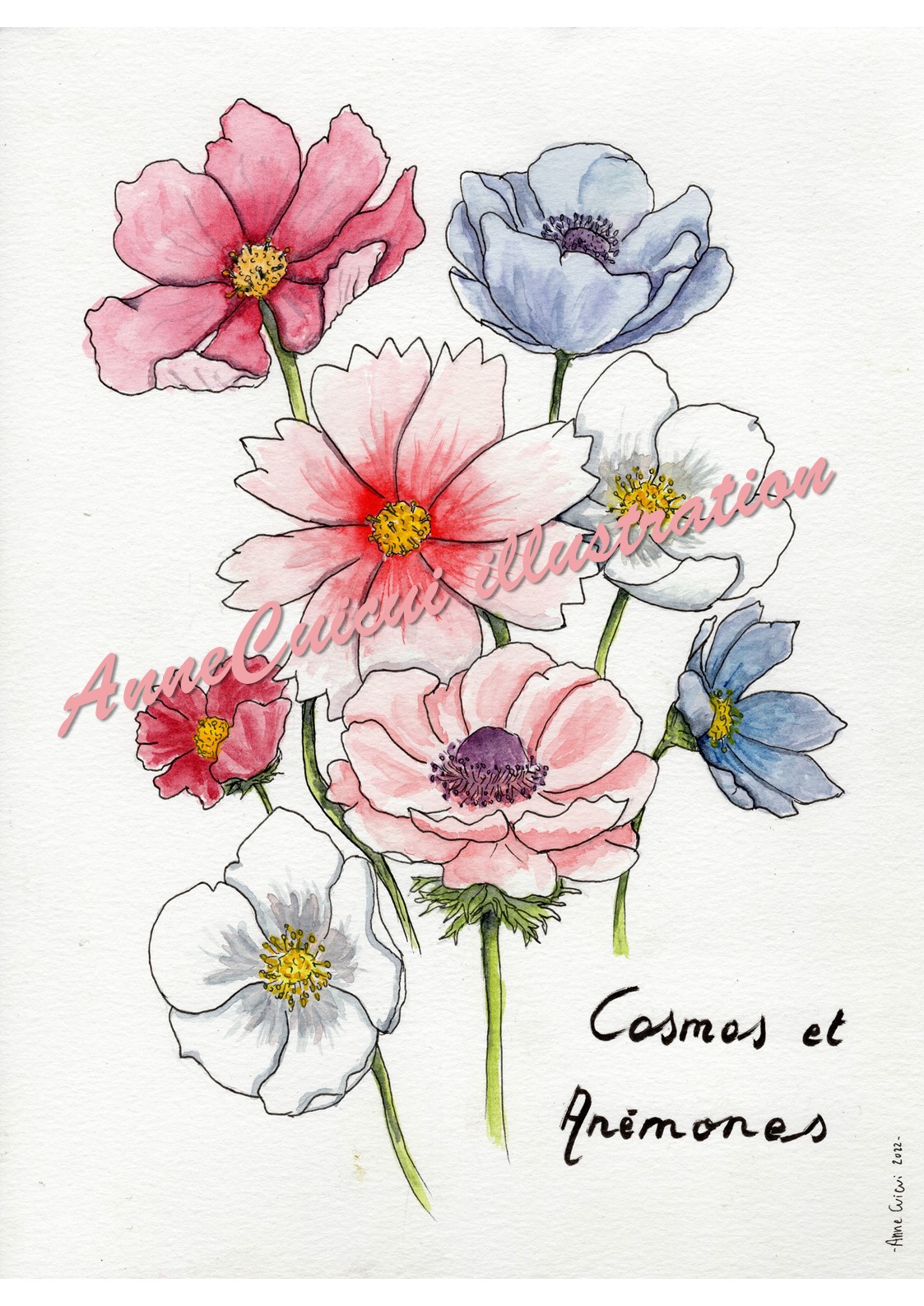 Aquarelle d’un bouquet de cosmos et d’anémones / Disponible en A5, A4 et A3