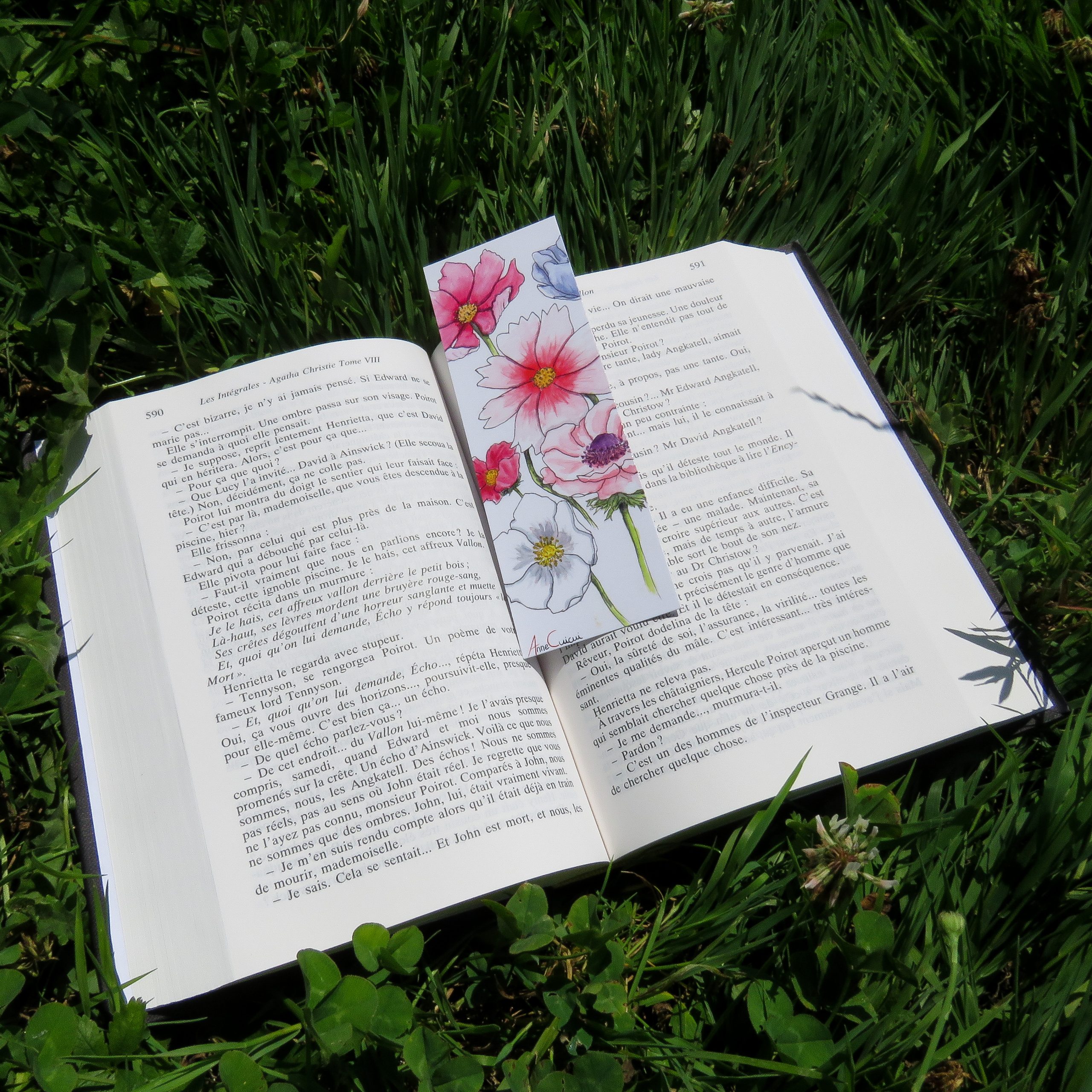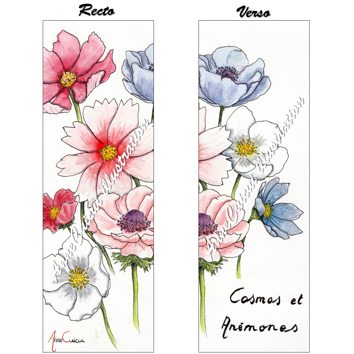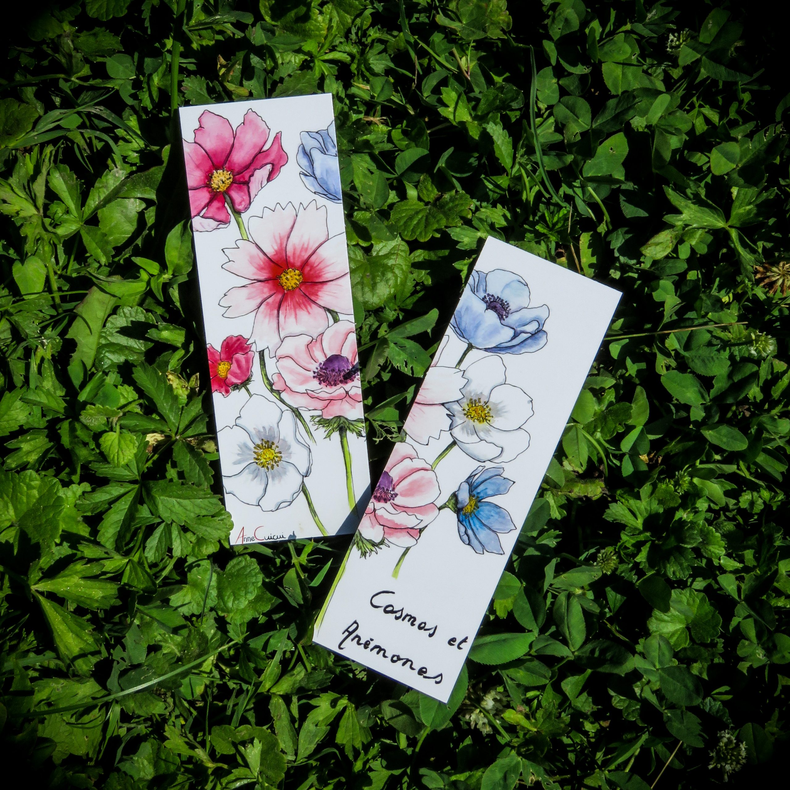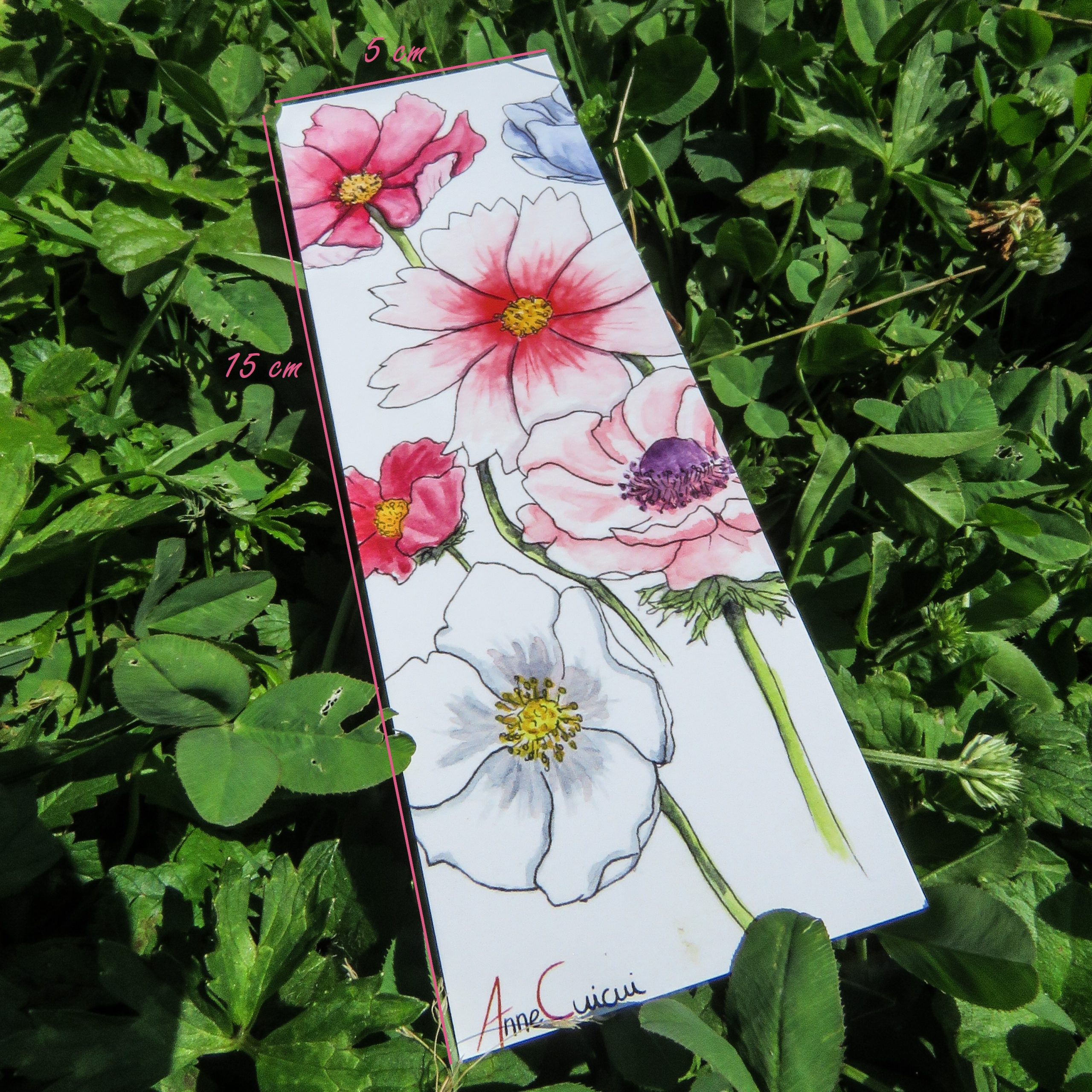 Marque-pages de cosmos et d’anémones / recto-verso / 5cm de large, 15cm de long