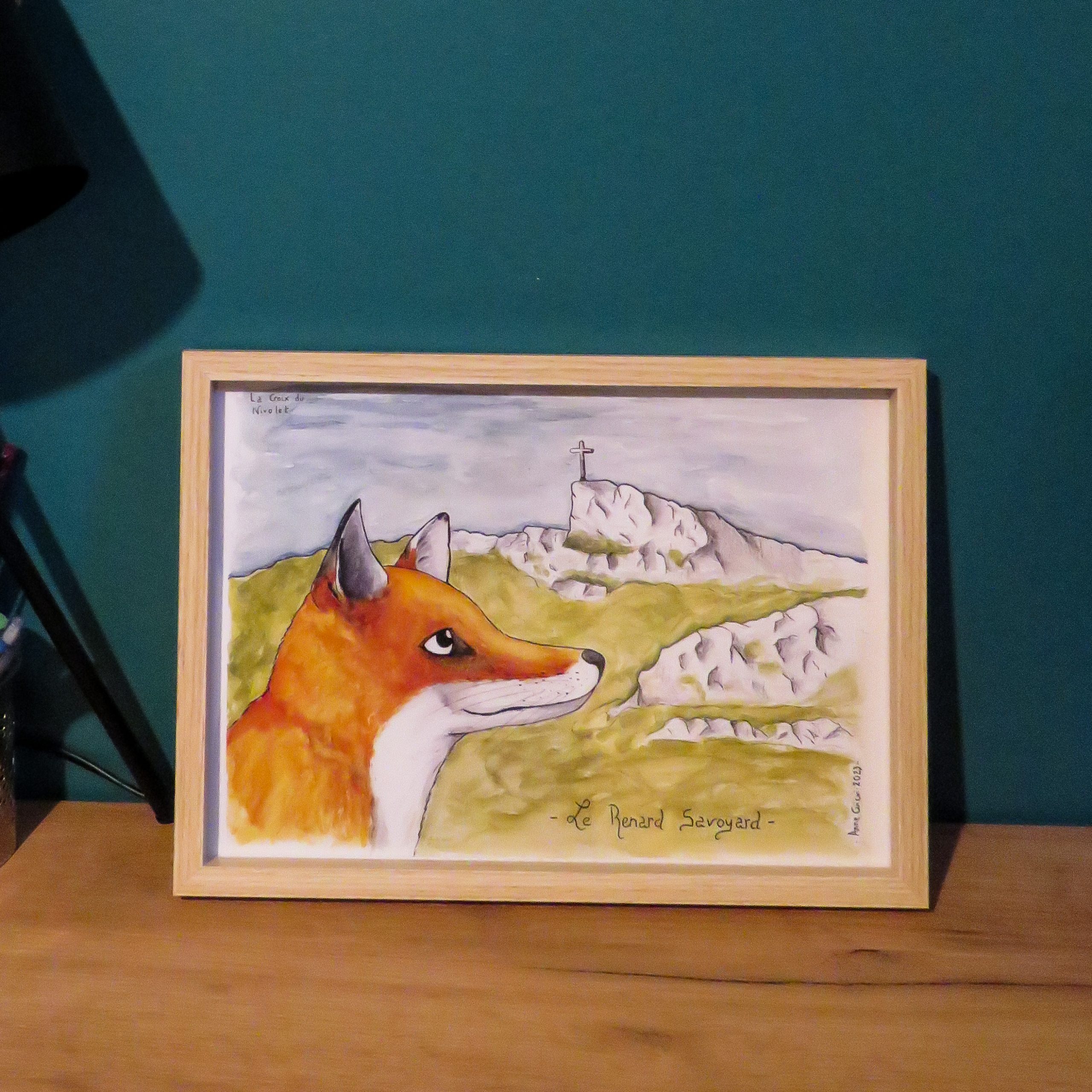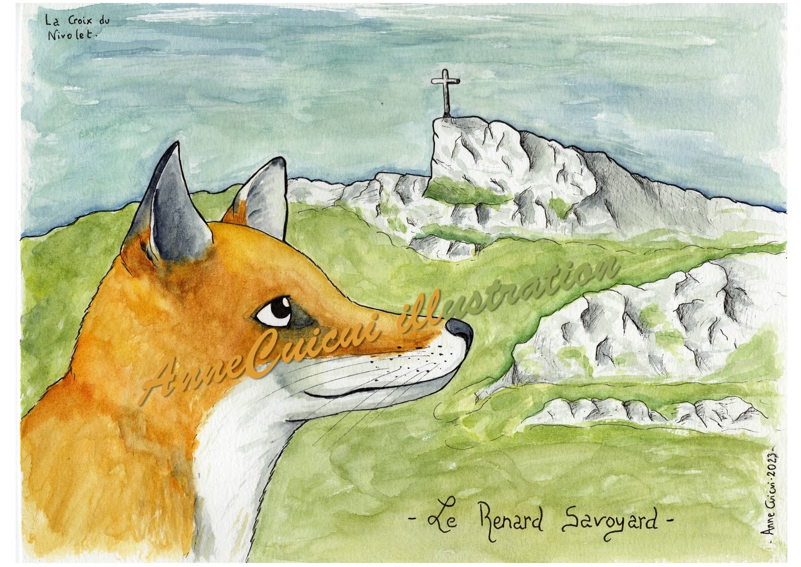 Aquarelle d’un renard avec la croix du Nivolet en arrière-plan (croix présente sur l’un des sommets des Bauges, visible depuis Chambéry) / Disponible en A5, A4 et A3