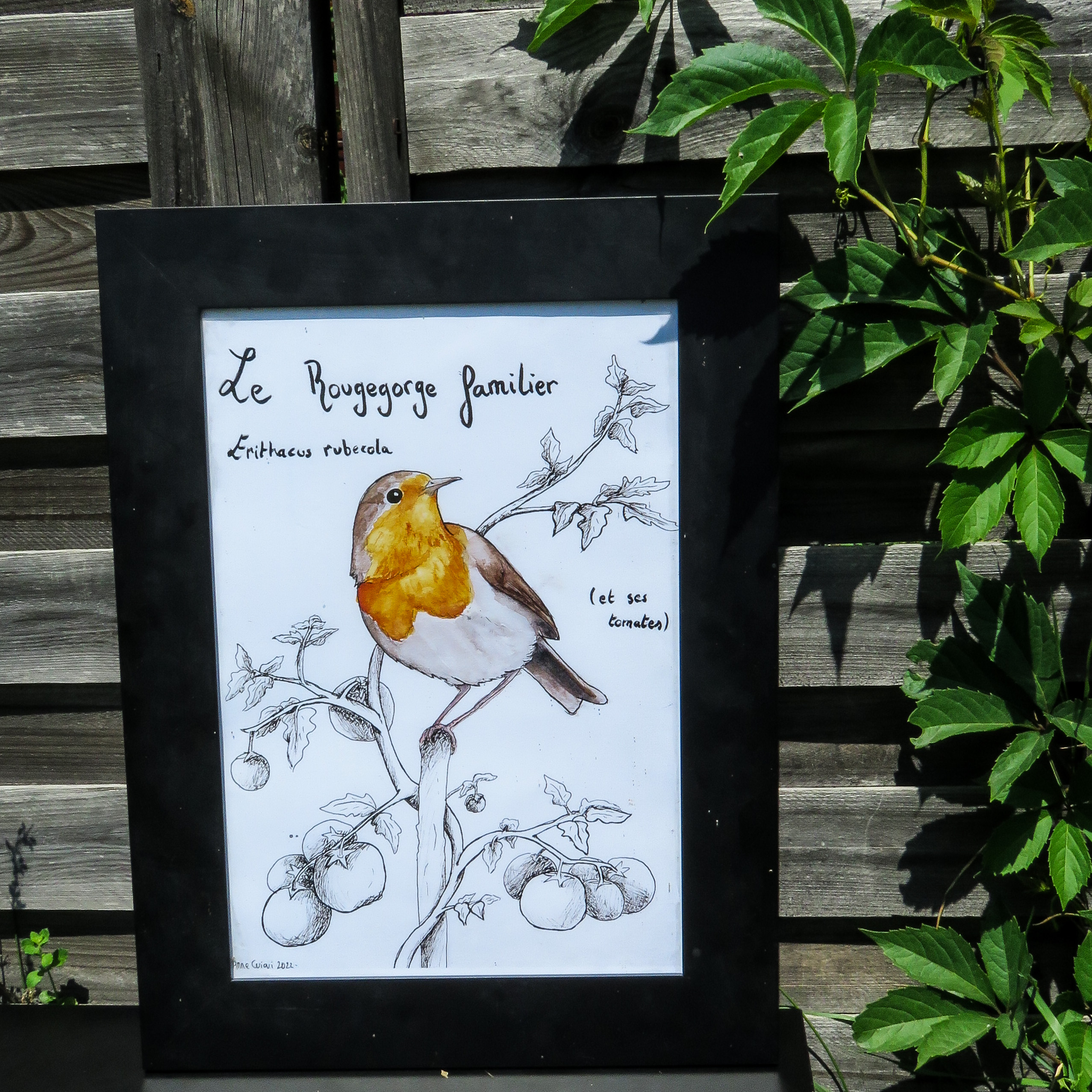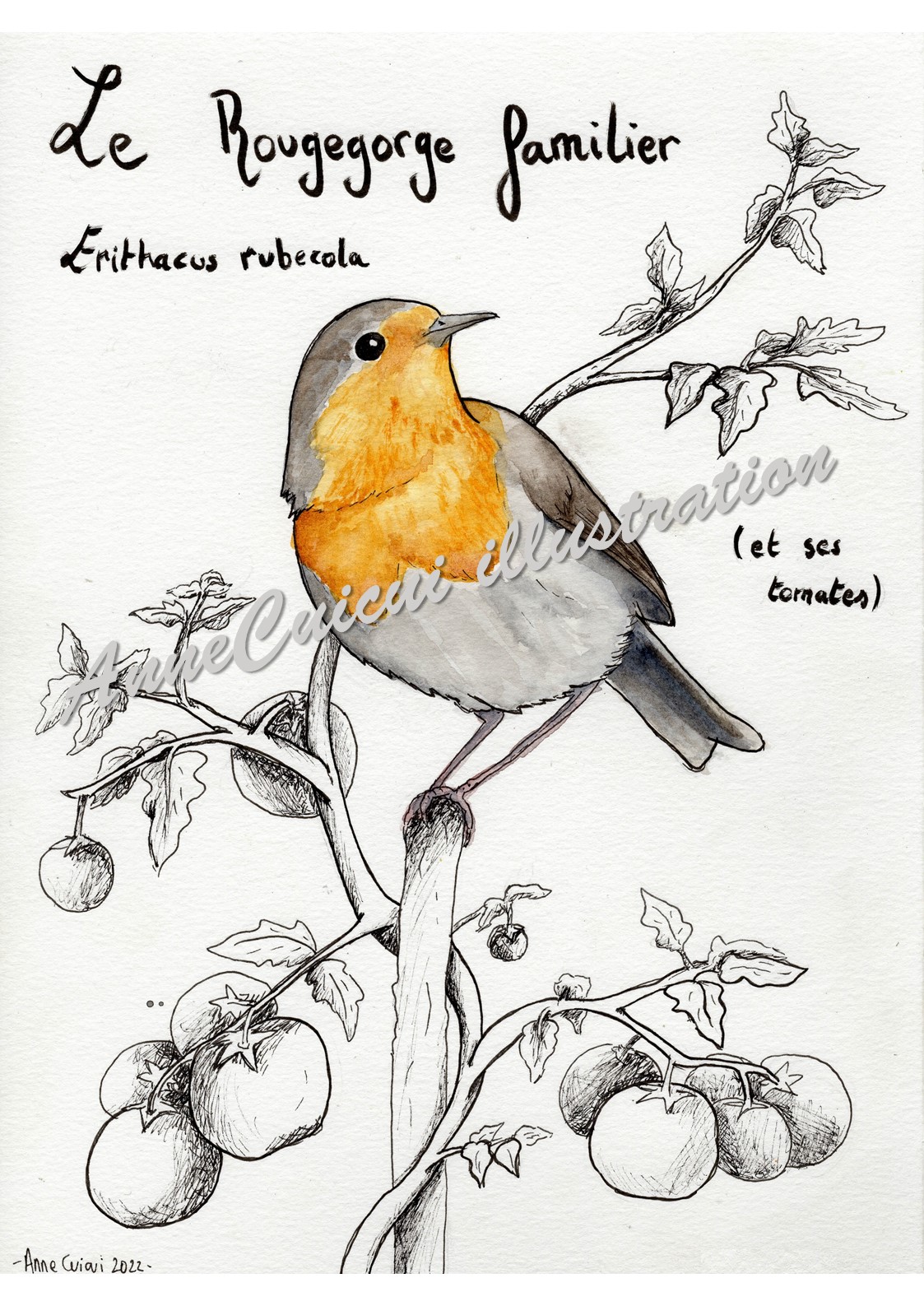 Aquarelle d’un rougegorge sur son pied de tomates / Disponible en A5, A4 et A3
